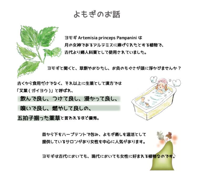 テンペ菌(発酵菌)を使って、よもぎをはじめハトムギ(発芽)、ドクダミ、ビワの葉、スギナ、タンポポ、クミスクチン、チコリなど10種以上の植物素材を発酵させてブレンドしています。